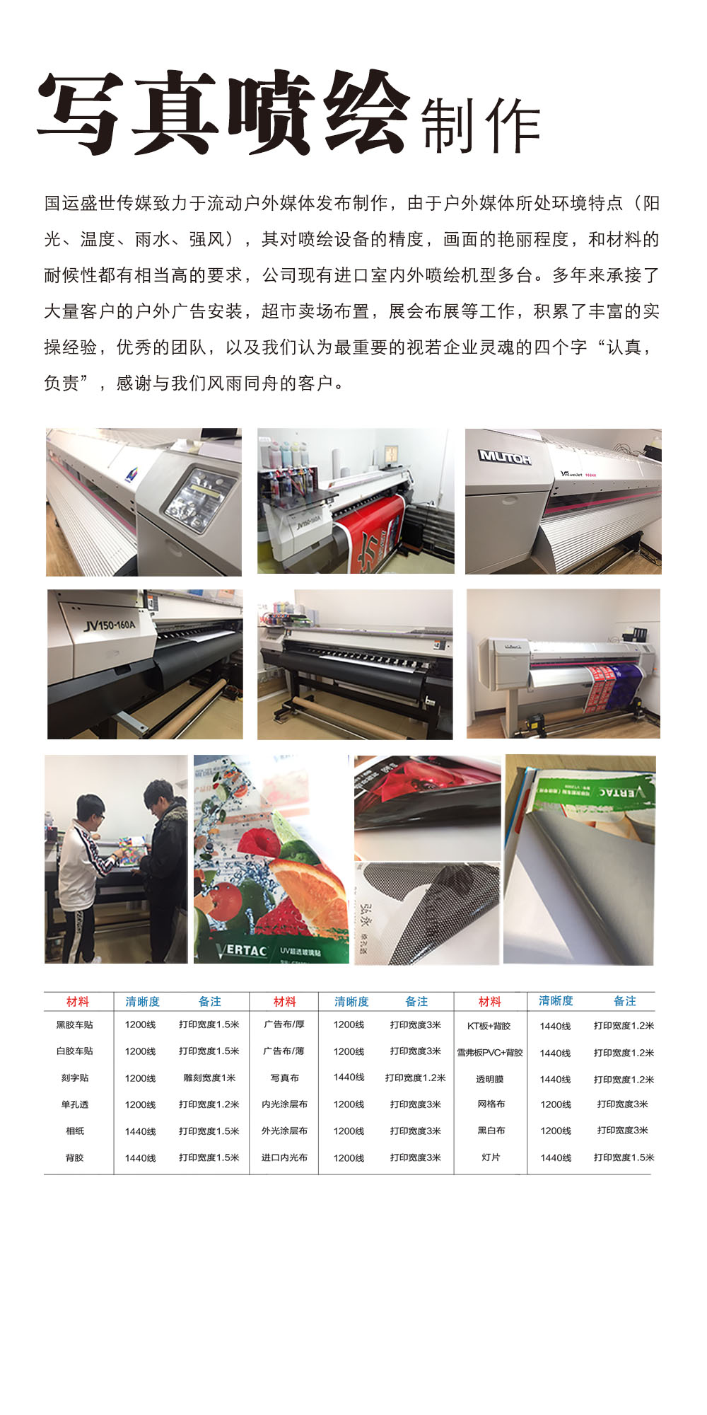 國運(yùn)傳媒致力于流動(dòng)媒體的制作,作為戶外高端媒體,其對噴繪設(shè)備的精度,畫面的艷麗程度,耐候性都有相當(dāng)高的要求,公司現(xiàn)有進(jìn)口室內(nèi)外噴繪機(jī)型多臺。多年來承接了大量的戶外廣告安裝,超市賣場布置,展會布展等工作,積累了豐富的經(jīng)驗(yàn),優(yōu)秀的團(tuán)隊(duì),以及我們認(rèn)為最重要的視若企業(yè)靈魂的四個(gè)字“信心,耐心”。感謝與我們風(fēng)雨同舟的客戶。